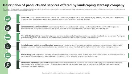 The purpose of this slide is to express the benefits the firm provides to its customers or clients. It offers lawn care, landscape design and installation, tree and shrub pruning, installation and maintenance of irrigation systems, hardscaping and sustainable landscaping practices etc. Get a simple yet stunning designed Description Of Products And Services Offered By Landscaping Start Lawn Care BP SS V. It is the best one to establish the tone in your meetings. It is an excellent way to make your presentations highly effective. So, download this PPT today from Slidegeeks and see the positive impacts. Our easy-to-edit Description Of Products And Services Offered By Landscaping Start Lawn Care BP SS V can be your go-to option for all upcoming conferences and meetings. So, what are you waiting for Grab this template today. The purpose of this slide is to express the benefits the firm provides to its customers or clients. It offers lawn care, landscape design and installation, tree and shrub pruning, installation and maintenance of irrigation systems, hardscaping and sustainable landscaping practices etc.