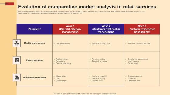 This slide exhibits development of business intelligence to assess metrics for product performance tracking. It helps retailers make better decisions with data driven insights on store performance. It presents information related to enabling technologies, casual variables, etc.Showcasing this set of slides titled Evolution Of Comparative Market Analysis In Retail Services Information Pdf The topics addressed in these templates are Enable Technologies, Performance Measures, Casual Variables All the content presented in this PPT design is completely editable. Download it and make adjustments in color, background, font etc. as per your unique business setting. This slide exhibits development of business intelligence to assess metrics for product performance tracking. It helps retailers make better decisions with data driven insights on store performance. It presents information related to enabling technologies, casual variables, etc.