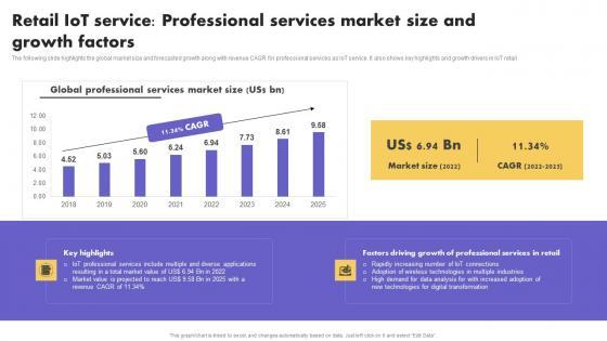 The following slide highlights the global market size and forecasted growth along with revenue CAGR for consulting services as IoT service. It also shows key highlights and growth drivers in IoT retail. Slidegeeks is here to make your presentations a breeze with IoT Application In Global Retail IoT Service Consulting Services Market Size And Growth Themes Pdf With our easy-to-use and customizable templates, you can focus on delivering your ideas rather than worrying about formatting. With a variety of designs to choose from, you are sure to find one that suits your needs. And with animations and unique photos, illustrations, and fonts, you can make your presentation pop. So whether you are giving a sales pitch or presenting to the board, make sure to check out Slidegeeks first The following slide highlights the global market size and forecasted growth along with revenue CAGR for consulting services as IoT service. It also shows key highlights and growth drivers in IoT retail