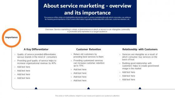 The purpose of this slide is to highlight the introductory part of service marketing through which corporates can address its meaning and importance. It also covers information regrading relationship with customers, customer retention, etc. Create an editable Service Promotion Plan About Service Marketing Overview And Its Importance Structure PDF that communicates your idea and engages your audience. Whether youre presenting a business or an educational presentation, pre-designed presentation templates help save time. Service Promotion Plan About Service Marketing Overview And Its Importance Structure PDF is highly customizable and very easy to edit, covering many different styles from creative to business presentations. Slidegeeks has creative team members who have crafted amazing templates. So, go and get them without any delay.