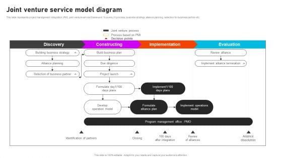 This slide represents project management integration PMI joint venture service framework. It covers JV process, business strategy, alliance planning, selection for business partner etc. There are so many reasons you need a Formulating International Promotional Campaign Strategy Joint Venture Service Model Diagram Topics PDF. The first reason is you can not spend time making everything from scratch, Thus, Slidegeeks has made presentation templates for you too. You can easily download these templates from our website easily.