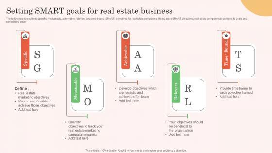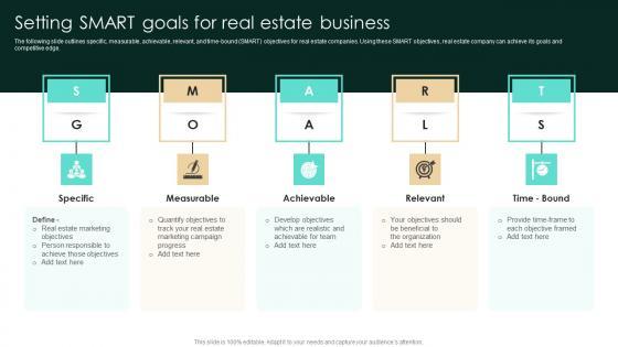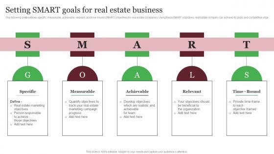 The following slide outlines specific, measurable, achievable, relevant, and time-bound SMART objectives for real estate companies. Using these SMART objectives, real estate company can achieve its goals and competitive edge. Find a pre-designed and impeccable Setting SMART Goals For Real Estate Business Template PDF. The templates can ace your presentation without additional effort. You can download these easy-to-edit presentation templates to make your presentation stand out from others. So, what are you waiting for Download the template from Slidegeeks today and give a unique touch to your presentation.