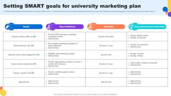 The following slide represents SMART goals of university marketing plan to . It includes elements such as increasing website traffic, boosting enrolment rate, optimizing social media engagement, improving alumni network, retention rate etc. Do you have an important presentation coming up Are you looking for something that will make your presentation stand out from the rest Look no further than University Marketing Guide Setting Smart Goals For University Marketing Plan Strategy SS V. With our professional designs, you can trust that your presentation will pop and make delivering it a smooth process. And with Slidegeeks, you can trust that your presentation will be unique and memorable. So why wait Grab University Marketing Guide Setting Smart Goals For University Marketing Plan Strategy SS V today and make your presentation stand out from the rest The following slide represents SMART goals of university marketing plan to . It includes elements such as increasing website traffic, boosting enrolment rate, optimizing social media engagement, improving alumni network, retention rate etc.