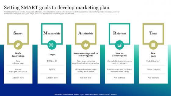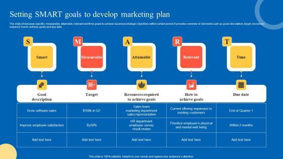 The slide showcases specific, measurable, attainable, relevant and time goals to achieve business strategic objectives within certain period. It provides overview of elements such as goals description, target, resources required, how to achieve goals and due date. Slidegeeks has constructed Comprehensive Guide For Sales And Advertising Processes Setting Smart Goals To Develop Marketing Plan Topics PDF after conducting extensive research and examination. These presentation templates are constantly being generated and modified based on user preferences and critiques from editors. Here, you will find the most attractive templates for a range of purposes while taking into account ratings and remarks from users regarding the content. This is an excellent jumping-off point to explore our content and will give new users an insight into our top-notch PowerPoint Templates.