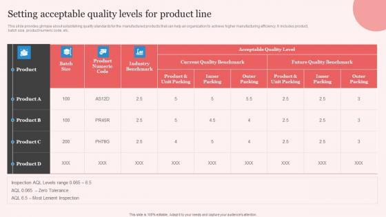 This slide provides glimpse about establishing quality standards for the manufactured products that can help an organization to achieve higher manufacturing efficiency. It includes product, batch size, product numeric code, etc. This modern and well-arranged Setting Acceptable Quality Levels For Product Line Streamlining Production Operational Structure PDF provides lots of creative possibilities. It is very simple to customize and edit with the Powerpoint Software. Just drag and drop your pictures into the shapes. All facets of this template can be edited with Powerpoint, no extra software is necessary. Add your own material, put your images in the places assigned for them, adjust the colors, and then you can show your slides to the world, with an animated slide included. This slide provides glimpse about establishing quality standards for the manufactured products that can help an organization to achieve higher manufacturing efficiency. It includes product, batch size, product numeric code, etc.