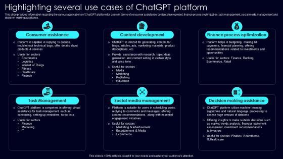 This slide provides information regarding the various applications of ChatGPT platform for users in terms of consumer assistance, content development, finance process optimization, task management, social media management and decision making assistance. Do you know about Slidesgeeks Highlighting Several Use Exploring Rise Of Generative AI In Artificial Intelligence Pictures Pdf These are perfect for delivering any kind od presentation. Using it, create PowerPoint presentations that communicate your ideas and engage audiences. Save time and effort by using our pre designed presentation templates that are perfect for a wide range of topic. Our vast selection of designs covers a range of styles, from creative to business, and are all highly customizable and easy to edit. Download as a PowerPoint template or use them as Google Slides themes. This slide provides information regarding the various applications of ChatGPT platform for users in terms of consumer assistance, content development, finance process optimization, task management, social media management and decision making assistance.