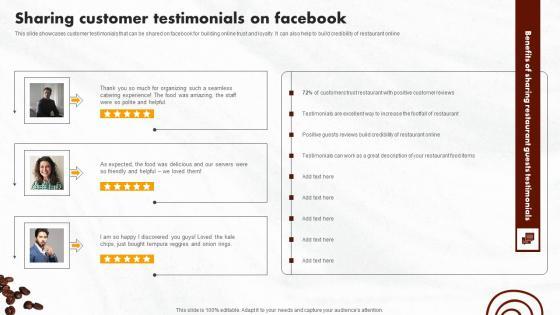This slide showcases customer testimonials that can be shared on Facebook for building online trust and loyalty. It can also help to build credibility of restaurant online. Slidegeeks is one of the best resources for PowerPoint templates. You can download easily and regulate Strategic Promotional Guide For Restaurant Business Advertising Sharing Customer Testimonials On Facebook Icons PDF for your personal presentations from our wonderful collection. A few clicks is all it takes to discover and get the most relevant and appropriate templates. Use our Templates to add a unique zing and appeal to your presentation and meetings. All the slides are easy to edit and you can use them even for advertisement purposes.