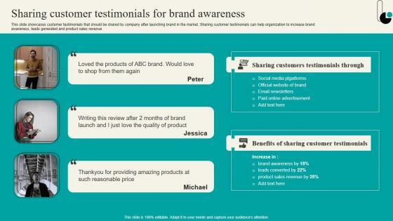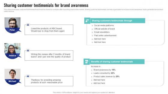 This slide showcases customer testimonials that should be shared by company after launching brand in the market. Sharing customer testimonials can help organization to increase brand awareness, leads generated and product sales revenue Present like a pro with Sharing Customer Testimonials For Brand Awareness Launching New Product Brand Information Pdf Create beautiful presentations together with your team, using our easy-to-use presentation slides. Share your ideas in real-time and make changes on the fly by downloading our templates. So whether you are in the office, on the go, or in a remote location, you can stay in sync with your team and present your ideas with confidence. With Slidegeeks presentation got a whole lot easier. Grab these presentations today. This slide showcases customer testimonials that should be shared by company after launching brand in the market. Sharing customer testimonials can help organization to increase brand awareness, leads generated and product sales revenue