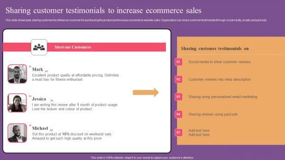This slide showcases sharing customers to influencer customer for purchasing the product and increase ecommerce website sales. Organization can share customer testimonials through social media, emails and paid ads. Create an editable Sharing Customer Testimonials Website Optimization To Improve Product Sale Topics Pdf that communicates your idea and engages your audience. Whether you are presenting a business or an educational presentation, pre designed presentation templates help save time. Sharing Customer Testimonials Website Optimization To Improve Product Sale Topics Pdf is highly customizable and very easy to edit, covering many different styles from creative to business presentations. Slidegeeks has creative team members who have crafted amazing templates. So, go and get them without any delay. This slide showcases sharing customers to influencer customer for purchasing the product and increase ecommerce website sales. Organization can share customer testimonials through social media, emails and paid ads.