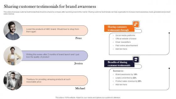 This slide showcases customer testimonials that should be shared by company after launching brand in the market. Sharing customer testimonials can help organization to increase brand awareness, leads generated and product sales revenue. Present like a pro with Sharing Customer Testimonials For Brand Awareness Product Advertising And Positioning Rules Pdf Create beautiful presentations together with your team, using our easy-to-use presentation slides. Share your ideas in real-time and make changes on the fly by downloading our templates. So whether you are in the office, on the go, or in a remote location, you can stay in sync with your team and present your ideas with confidence. With Slidegeeks presentation got a whole lot easier. Grab these presentations today. This slide showcases customer testimonials that should be shared by company after launching brand in the market. Sharing customer testimonials can help organization to increase brand awareness, leads generated and product sales revenue.