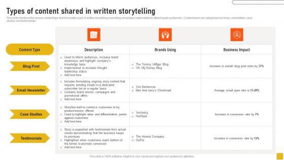This slide mentions the various content type that formulate a part of written storytelling marketing campaigns implemented to attract target audiences. Content types are categorized as blogs, newsletters, case studies and testimonials. Retrieve professionally designed Types Of Content Shared In Written Storytelling Comprehensive Guide Slides Pdf to effectively convey your message and captivate your listeners. Save time by selecting pre-made slideshows that are appropriate for various topics, from business to educational purposes. These themes come in many different styles, from creative to corporate, and all of them are easily adjustable and can be edited quickly. Access them as PowerPoint templates or as Google Slides themes. You do not have to go on a hunt for the perfect presentation because Slidegeeks got you covered from everywhere. This slide mentions the various content type that formulate a part of written storytelling marketing campaigns implemented to attract target audiences. Content types are categorized as blogs, newsletters, case studies and testimonials.