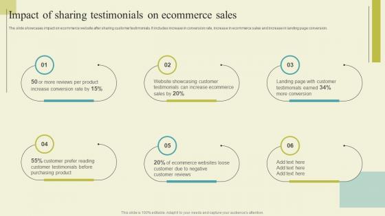 The slide showcases impact on ecommerce website after sharing customer testimonials. It includes increase in conversion rate, increase in ecommerce sales and increase in landing page conversion. From laying roadmaps to briefing everything in detail, our templates are perfect for you. You can set the stage with your presentation slides. All you have to do is download these easy to edit and customizable templates. Impact Of Sharing Testimonials On Ecommerce Sales Sample PDF will help you deliver an outstanding performance that everyone would remember and praise you for. Do download this presentation today.