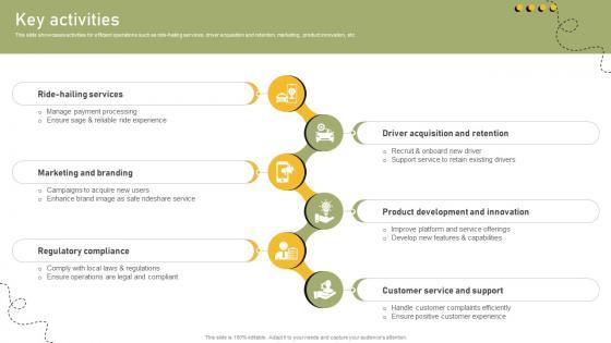 This slide showcases activities for efficient operations such as ride-hailing services, driver acquisition and retention, marketing, product innovation, etc. Get a simple yet stunning designed Key Activities Shared Transportation Platform Business Model BMC SS V. It is the best one to establish the tone in your meetings. It is an excellent way to make your presentations highly effective. So, download this PPT today from Slidegeeks and see the positive impacts. Our easy-to-edit Key Activities Shared Transportation Platform Business Model BMC SS V can be your go-to option for all upcoming conferences and meetings. So, what are you waiting for Grab this template today. This slide showcases activities for efficient operations such as ride-hailing services, driver acquisition and retention, marketing, product innovation, etc.
