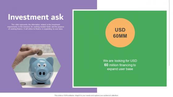 This slide represents the information related to the investment requirements to the investors for seeking needed funds and the purpose of seeking finance. It will utilize its finance in expanding its user base. Whether you have daily or monthly meetings, a brilliant presentation is necessary. Investment Ask Carelulu Shareholders Fund Raising Pitch Deck Download Pdf can be your best option for delivering a presentation. Represent everything in detail using Investment Ask Carelulu Shareholders Fund Raising Pitch Deck Download Pdf and make yourself stand out in meetings. The template is versatile and follows a structure that will cater to your requirements. All the templates prepared by Slidegeeks are easy to download and edit. Our research experts have taken care of the corporate themes as well. So, give it a try and see the results. This slide represents the information related to the investment requirements to the investors for seeking needed funds and the purpose of seeking finance. It will utilize its finance in expanding its user base.