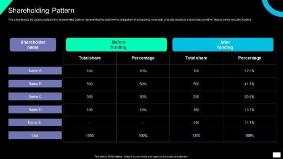 Presenting this set of slides with name investing in start ups shareholding pattern ppt pictures example pdf. The topics discussed in these slides are shareholding pattern, after funding, before funding, total shares. This is a completely editable PowerPoint presentation and is available for immediate download. Download now and impress your audience.