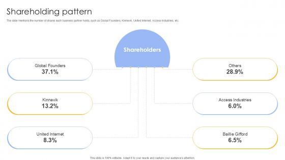 The slide mentions the number of shares each business partner holds, such as Global Founders, Kinnevik, United Internet, Access Industries, etc. Find highly impressive Shareholding Pattern Investment Company Investor Funding Elevator Ppt Sample on Slidegeeks to deliver a meaningful presentation. You can save an ample amount of time using these presentation templates. No need to worry to prepare everything from scratch because Slidegeeks experts have already done a huge research and work for you. You need to download Shareholding Pattern Investment Company Investor Funding Elevator Ppt Sample for your upcoming presentation. All the presentation templates are 100 percent editable and you can change the color and personalize the content accordingly. Download now The slide mentions the number of shares each business partner holds, such as Global Founders, Kinnevik, United Internet, Access Industries, etc.