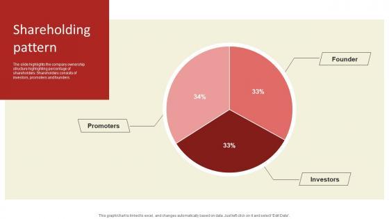 This slide covers understanding of the shareholding pattern of the company. The purpose of this template is to provide an overview on shareholders with maximum share and other stakeholders along with percentages of shares in the company with key insights. This modern and well-arranged Shareholding Pattern Investment Opportunities Platform Funding Elevator Pitch Deck provides lots of creative possibilities. It is very simple to customize and edit with the Powerpoint Software. Just drag and drop your pictures into the shapes. All facets of this template can be edited with Powerpoint, no extra software is necessary. Add your own material, put your images in the places assigned for them, adjust the colors, and then you can show your slides to the world, with an animated slide included. This slide covers understanding of the shareholding pattern of the company. The purpose of this template is to provide an overview on shareholders with maximum share and other stakeholders along with percentages of shares in the company with key insights.
