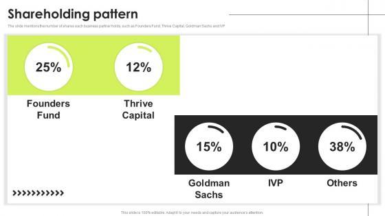 This Shareholding Pattern Real Estate Investment Funding Elevator Elements PDF is perfect for any presentation, be it in front of clients or colleagues. It is a versatile and stylish solution for organizing your meetings. The Shareholding Pattern Real Estate Investment Funding Elevator Elements PDF features a modern design for your presentation meetings. The adjustable and customizable slides provide unlimited possibilities for acing up your presentation. Slidegeeks has done all the homework before launching the product for you. So, do not wait, grab the presentation templates today The slide mentions the number of shares each business partner holds, such as Founders Fund, Thrive Capital, Goldman Sachs and IVP.