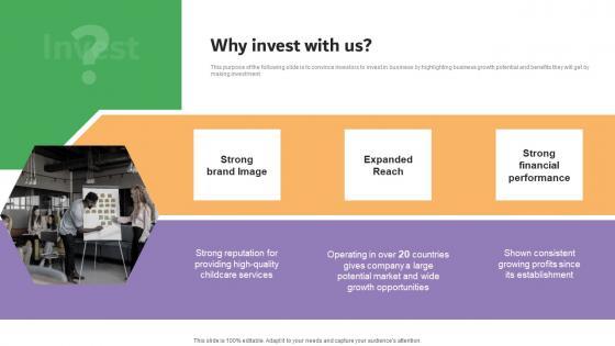 This purpose of the following slide is to convince investors to invest in business by highlighting business growth potential and benefits they will get by making investment. Explore a selection of the finest Why Invest With Us Carelulu Shareholders Fund Raising Pitch Deck Template Pdf here. With a plethora of professionally designed and pre made slide templates, you can quickly and easily find the right one for your upcoming presentation. You can use our Why Invest With Us Carelulu Shareholders Fund Raising Pitch Deck Template Pdf to effectively convey your message to a wider audience. Slidegeeks has done a lot of research before preparing these presentation templates. The content can be personalized and the slides are highly editable. Grab templates today from Slidegeeks. This purpose of the following slide is to convince investors to invest in business by highlighting business growth potential and benefits they will get by making investment.