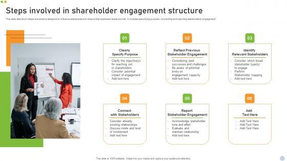 This slide lists down steps and actions designed to influence stakeholders to ensure that business needs are met. It includes specifying purpose, connecting and reporting stakeholders engagement. Pitch your topic with ease and precision using this Steps Involved In Shareholder Engagement Structure Brochure Pdf. This layout presents information on Identify Relevant Stakeholders, Report Stakeholder Engagement, Connect With Stakeholders. It is also available for immediate download and adjustment. So, changes can be made in the color, design, graphics or any other component to create a unique layout. This slide lists down steps and actions designed to influence stakeholders to ensure that business needs are met. It includes specifying purpose, connecting and reporting stakeholders engagement.