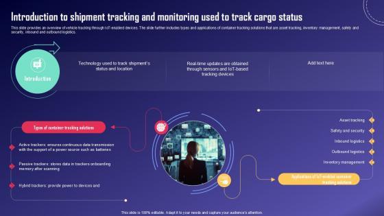 This slide provides an overview of vehicle tracking through IoT-enabled devices. The slide further includes types and applications of container tracking solutions that are asset tracking, inventory management, safety and security, inbound and outbound logistics. This modern and well-arranged Introduction To Shipment Tracking IoT Fleet Monitoring Ppt Slide IoT SS V provides lots of creative possibilities. It is very simple to customize and edit with the Powerpoint Software. Just drag and drop your pictures into the shapes. All facets of this template can be edited with Powerpoint, no extra software is necessary. Add your own material, put your images in the places assigned for them, adjust the colors, and then you can show your slides to the world, with an animated slide included. This slide provides an overview of vehicle tracking through IoT-enabled devices. The slide further includes types and applications of container tracking solutions that are asset tracking, inventory management, safety and security, inbound and outbound logistics.