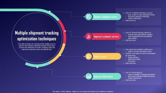 This slide provides an overview of the multiple ways to improve and enhance shipment tracking. Major ways covered are optimizing of routes, reducing costs and improving customer service and efficiencies. Present like a pro with Multiple Shipment Tracking IoT Fleet Monitoring Ppt PowerPoint IoT SS V. Create beautiful presentations together with your team, using our easy-to-use presentation slides. Share your ideas in real-time and make changes on the fly by downloading our templates. So whether you are in the office, on the go, or in a remote location, you can stay in sync with your team and present your ideas with confidence. With Slidegeeks presentation got a whole lot easier. Grab these presentations today. This slide provides an overview of the multiple ways to improve and enhance shipment tracking. Major ways covered are optimizing of routes, reducing costs and improving customer service and efficiencies.