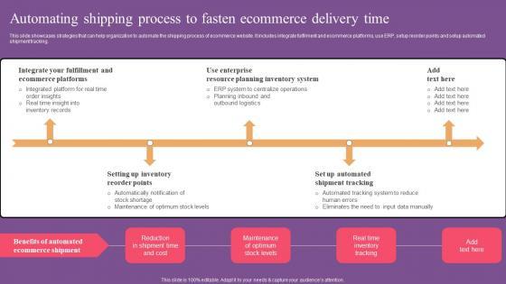 This slide showcases strategies that can help organization to automate the shipping process of ecommerce website. It includes integrate fulfilment and ecommerce platforms, use ERP, setup reorder points and setup automated shipment tracking. Slidegeeks is one of the best resources for PowerPoint templates. You can download easily and regulate Automating Shipping Process Website Optimization To Improve Product Sale Sample Pdf for your personal presentations from our wonderful collection. A few clicks is all it takes to discover and get the most relevant and appropriate templates. Use our Templates to add a unique zing and appeal to your presentation and meetings. All the slides are easy to edit and you can use them even for advertisement purposes. This slide showcases strategies that can help organization to automate the shipping process of ecommerce website. It includes integrate fulfilment and ecommerce platforms, use ERP, setup reorder points and setup automated shipment tracking.