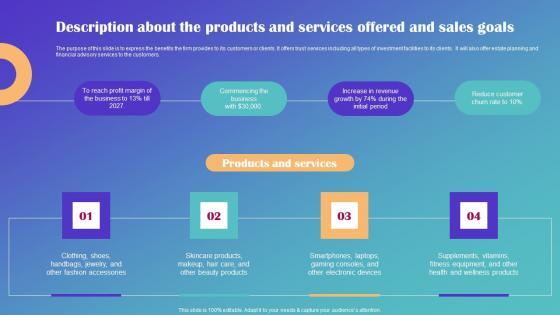 The purpose of this slide is to express the benefits the firm provides to its customers or clients. It offers trust services including all types of investment facilities to its clients. It will also offer estate planning and financial advisory services to the customers. Retrieve professionally designed Description About The Products And Services Offered Drop Shipping Business Plan Background Pdf to effectively convey your message and captivate your listeners. Save time by selecting pre-made slideshows that are appropriate for various topics, from business to educational purposes. These themes come in many different styles, from creative to corporate, and all of them are easily adjustable and can be edited quickly. Access them as PowerPoint templates or as Google Slides themes. You do not have to go on a hunt for the perfect presentation because Slidegeeks got you covered from everywhere. The purpose of this slide is to express the benefits the firm provides to its customers or clients. It offers trust services including all types of investment facilities to its clients. It will also offer estate planning and financial advisory services to the customers.