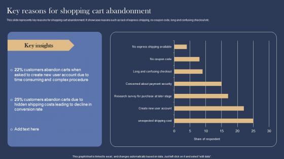 This slide represents key reasons for shopping cart abandonment. It showcase reasons such as lack of express shipping, no coupon code, long and confusing checkout etc. Are you searching for a Key Reasons For Shopping Management And Marketing Strategies For E Commerce Graphics Pdf that is uncluttered, straightforward, and original Its easy to edit, and you can change the colors to suit your personal or business branding. For a presentation that expresses how much effort you have put in, this template is ideal With all of its features, including tables, diagrams, statistics, and lists, its perfect for a business plan presentation. Make your ideas more appealing with these professional slides. Download Key Reasons For Shopping Management And Marketing Strategies For E Commerce Graphics Pdf from Slidegeeks today. This slide represents key reasons for shopping cart abandonment. It showcase reasons such as lack of express shipping, no coupon code, long and confusing checkout etc.