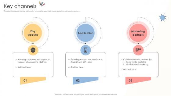 This slide showcases online retail platforms key channels that are website, mobile applications and marketing partners. From laying roadmaps to briefing everything in detail, our templates are perfect for you. You can set the stage with your presentation slides. All you have to do is download these easy-to-edit and customizable templates. Key Channels Online Shopping Business Model BMC SS V will help you deliver an outstanding performance that everyone would remember and praise you for. Do download this presentation today. This slide showcases online retail platforms key channels that are website, mobile applications and marketing partners.