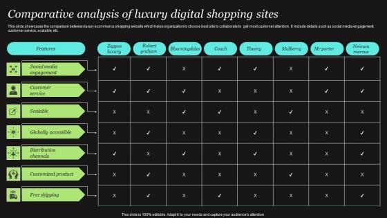 This slide showcases the comparison between luxury ecommerce shopping website which helps organization to choose best site to collaborate to get most customer attention . It include details such as social media engagement, customer service, scalable, etc. Pitch your topic with ease and precision using this Comparative Analysis Of Luxury Digital Shopping Sites Information Pdf This layout presents information on Social Media Engagement, Customer Service, Globally Accessible It is also available for immediate download and adjustment. So, changes can be made in the color, design, graphics or any other component to create a unique layout. This slide showcases the comparison between luxury ecommerce shopping website which helps organization to choose best site to collaborate to get most customer attention . It include details such as social media engagement, customer service, scalable, etc.