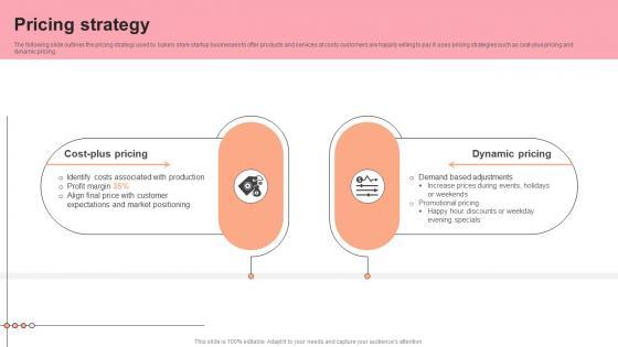 The following slide outlines the pricing strategy used by bakery store startup businesses to offer products and services at costs customers are happily willing to pay It uses pricing strategies such as cost-plus pricing and dynamic pricing. Make sure to capture your audiences attention in your business displays with our gratis customizable Pricing Strategy Pastry Shop Market Entry Plan GTM SS V. These are great for business strategies, office conferences, capital raising or task suggestions. If you desire to acquire more customers for your tech business and ensure they stay satisfied, create your own sales presentation with these plain slides. The following slide outlines the pricing strategy used by bakery store startup businesses to offer products and services at costs customers are happily willing to pay It uses pricing strategies such as cost-plus pricing and dynamic pricing.