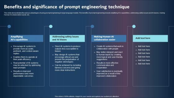 This slide demonstrates the various advantages of using prompt engineering in large language models. The benefits of prompt engineering include amplifying AIs capabilities, addressing safety issues and AI biases, making Human-AI collaboration easier, etc. Present like a pro with Benefits And Significance Of Prompt Engineering Technique Formats Pdf Create beautiful presentations together with your team, using our easy-to-use presentation slides. Share your ideas in real-time and make changes on the fly by downloading our templates. So whether you are in the office, on the go, or in a remote location, you can stay in sync with your team and present your ideas with confidence. With Slidegeeks presentation got a whole lot easier. Grab these presentations today. This slide demonstrates the various advantages of using prompt engineering in large language models. The benefits of prompt engineering include amplifying AIs capabilities, addressing safety issues and AI biases, making Human-AI collaboration easier, etc