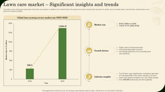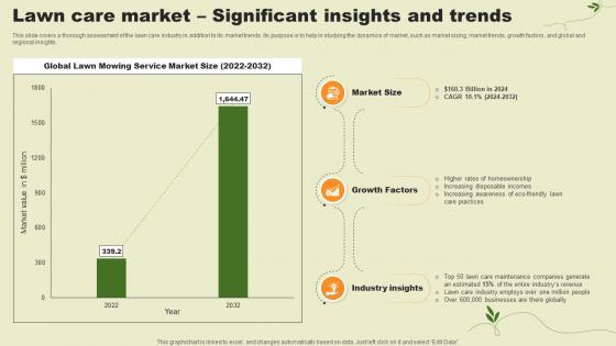 This slide covers a thorough assessment of the lawn care industry in addition to its market trends. Its purpose is to help in studying the dynamics of market, such as market sizing, market trends, growth factors, and global and regional insights. This modern and well-arranged Lawn Care Services Business Plan Lawn Care Market Significant Insights And Trends BP SS V provides lots of creative possibilities. It is very simple to customize and edit with the Powerpoint Software. Just drag and drop your pictures into the shapes. All facets of this template can be edited with Powerpoint, no extra software is necessary. Add your own material, put your images in the places assigned for them, adjust the colors, and then you can show your slides to the world, with an animated slide included. This slide covers a thorough assessment of the lawn care industry in addition to its market trends. Its purpose is to help in studying the dynamics of market, such as market sizing, market trends, growth factors, and global and regional insights.