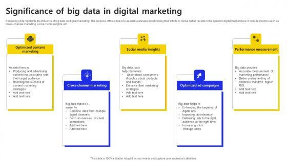 Following slide highlights the influence of big data on digital marketing. The purpose of this slide is to assist businesses in optimizing their efforts to derive better results in the dynamic digital marketplace. It includes factors such as cross-channel marketing, social media insights, etc. Showcasing this set of slides titled Significance Of Big Data In Digital Marketing Ppt Icon Good PDF. The topics addressed in these templates are Dynamic Digital Marketplace, Cross Channel Marketing, Social Media Insights. All the content presented in this PPT design is completely editable. Download it and make adjustments in color, background, font etc. as per your unique business setting. Following slide highlights the influence of big data on digital marketing. The purpose of this slide is to assist businesses in optimizing their efforts to derive better results in the dynamic digital marketplace. It includes factors such as cross-channel marketing, social media insights, etc.