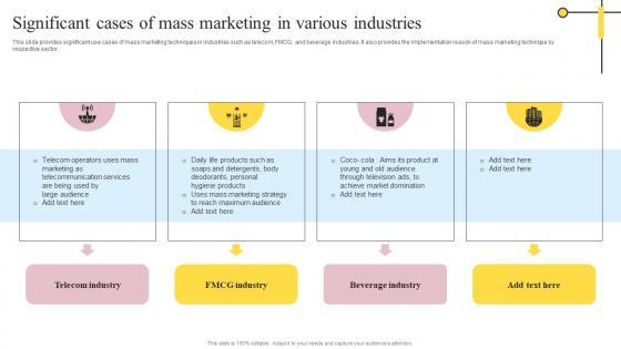 This slide provides significant use cases of mass marketing techniques in industries such as telecom, FMCG, and beverage industries. It also provides the implementation reason of mass marketing technique by respective sector. The best PPT templates are a great way to save time, energy, and resources. Slidegeeks have 100 percent editable powerpoint slides making them incredibly versatile. With these quality presentation templates, you can create a captivating and memorable presentation by combining visually appealing slides and effectively communicating your message. Download Significant Cases Of Mass Marketing In Various Industries In Depth Overview Of Mass Formats Pdf from Slidegeeks and deliver a wonderful presentation. This slide provides significant use cases of mass marketing techniques in industries such as telecom, FMCG, and beverage industries. It also provides the implementation reason of mass marketing technique by respective sector.