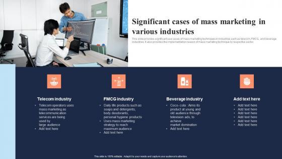 This slide provides significant use cases of mass marketing techniques in industries such as telecom, FMCG, and beverage industries. It also provides the implementation reason of mass marketing technique by respective sector. The Significant Cases Of Mass Marketing In Various Definitive Guide On Mass Advertising Topics Pdf is a compilation of the most recent design trends as a series of slides. It is suitable for any subject or industry presentation, containing attractive visuals and photo spots for businesses to clearly express their messages. This template contains a variety of slides for the user to input data, such as structures to contrast two elements, bullet points, and slides for written information. Slidegeeks is prepared to create an impression. This slide provides significant use cases of mass marketing techniques in industries such as telecom, FMCG, and beverage industries. It also provides the implementation reason of mass marketing technique by respective sector.