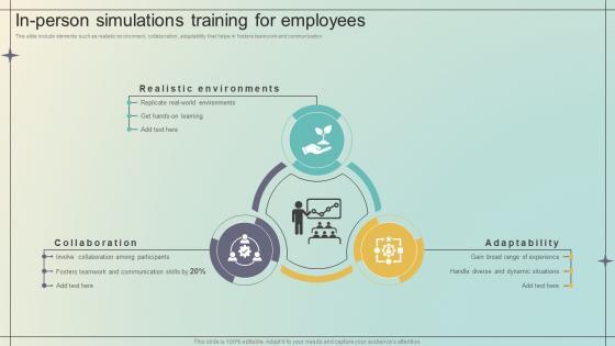 This slide include elements such as realistic environment, collaboration, adaptability that helps in fosters teamwork and communication. Find highly impressive Immersive Training For Practical In Person Simulations Training For Employees DTE SS V on Slidegeeks to deliver a meaningful presentation. You can save an ample amount of time using these presentation templates. No need to worry to prepare everything from scratch because Slidegeeks experts have already done a huge research and work for you. You need to download Immersive Training For Practical In Person Simulations Training For Employees DTE SS V for your upcoming presentation. All the presentation templates are 100 percent editable and you can change the color and personalize the content accordingly. Download now This slide include elements such as realistic environment, collaboration, adaptability that helps in fosters teamwork and communication.