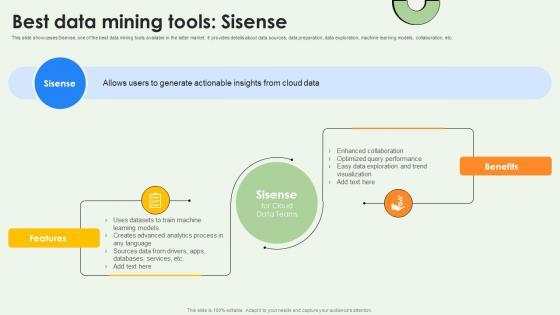 This slide showcases Sisense, one of the best data mining tools available in the latter market. It provides details about data sources, data preparation, data exploration, machine learning models, collaboration, etc. Do you have to make sure that everyone on your team knows about any specific topic I yes, then you should give Best Data Mining Tools Sisense Using Data Mining Tools To Optimize Processes AI SS V a try. Our experts have put a lot of knowledge and effort into creating this impeccable Best Data Mining Tools Sisense Using Data Mining Tools To Optimize Processes AI SS V. You can use this template for your upcoming presentations, as the slides are perfect to represent even the tiniest detail. You can download these templates from the Slidegeeks website and these are easy to edit. So grab these today This slide showcases Sisense, one of the best data mining tools available in the latter market. It provides details about data sources, data preparation, data exploration, machine learning models, collaboration, etc.