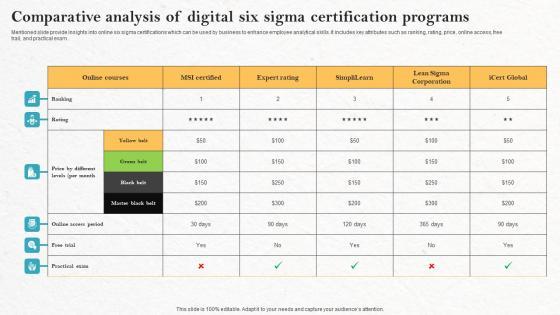 Mentioned slide provide insights into online six sigma certifications which can be used by business to enhance employee analytical skills. It includes key attributes such as ranking, rating, price, online access, free trail, and practical exam. Showcasing this set of slides titled Comparative Analysis Of Digital Six Sigma Certification Programs Infographics Pdf. The topics addressed in these templates are Comparative Analysis, Digital Six Sigma, Certification Programs, Practical Exam. All the content presented in this PPT design is completely editable. Download it and make adjustments in color, background, font etc. as per your unique business setting. Mentioned slide provide insights into online six sigma certifications which can be used by business to enhance employee analytical skills. It includes key attributes such as ranking, rating, price, online access, free trail, and practical exam.