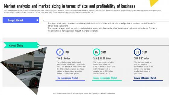 This slide provides a brief gist of customer analysis of the insurance agency business. This slide covers a brief about the business target market, which area and what geographical segment the company will be acquiring and market sizing compared to TAM, Sam and SOM i.e. how much serviceable market can be obtained by the company till year 2027. This Market Analysis And Market Sizing In Terms Of Size Automobile Insurance Agency Professional Pdf is perfect for any presentation, be it in front of clients or colleagues. It is a versatile and stylish solution for organizing your meetings. The Market Analysis And Market Sizing In Terms Of Size Automobile Insurance Agency Professional Pdf features a modern design for your presentation meetings. The adjustable and customizable slides provide unlimited possibilities for acing up your presentation. Slidegeeks has done all the homework before launching the product for you. So, do not wait, grab the presentation templates today This slide provides a brief gist of customer analysis of the insurance agency business. This slide covers a brief about the business target market, which area and what geographical segment the company will be acquiring and market sizing compared to TAM, Sam and SOM i.e. how much serviceable market can be obtained by the company till year 2027.