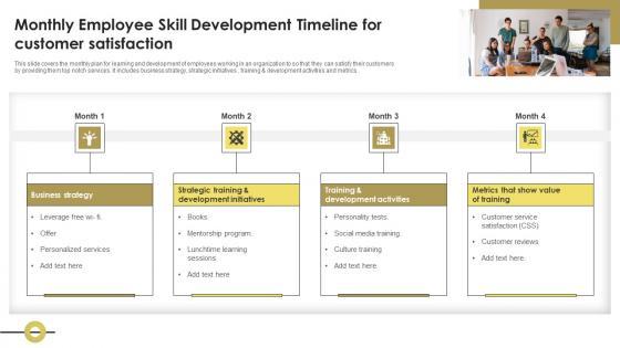 This slide covers the monthly plan for learning and development of employees working in an organization to so that they can satisfy their customers by providing them top notch services. It includes business strategy, strategic initiatives, training and development activities and metrics. Showcasing this set of slides titled Monthly Employee Skill Development Timeline For Customer Satisfaction Icons Pdf. The topics addressed in these templates are Business Strategy, Development Activities, Show Value Of Training. All the content presented in this PPT design is completely editable. Download it and make adjustments in color, background, font etc. as per your unique business setting. This slide covers the monthly plan for learning and development of employees working in an organization to so that they can satisfy their customers by providing them top notch services. It includes business strategy, strategic initiatives, training and development activities and metrics.