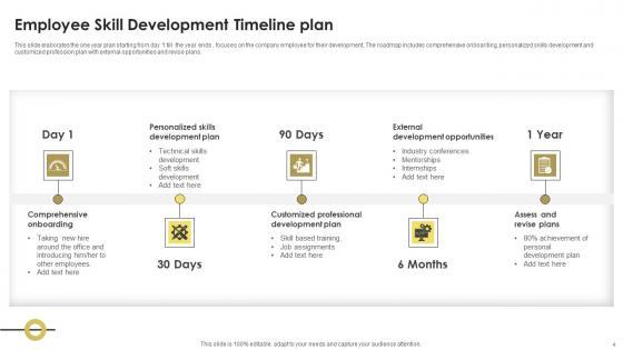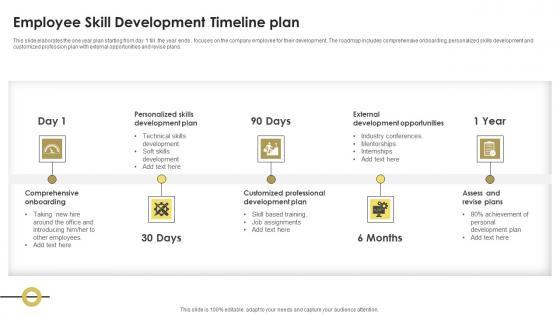This slide elaborates the one year plan starting from day 1 till the year ends , focuses on the company employee for their development. The roadmap includes comprehensive onboarding, personalized skills development and customized profession plan with external opportunities and revise plans. Pitch your topic with ease and precision using this Employee Skill Development Timeline Plan Topics Pdf. This layout presents information on Comprehensive Onboarding, External Development Opportunities, Assess And Revise Plans. It is also available for immediate download and adjustment. So, changes can be made in the color, design, graphics or any other component to create a unique layout. This slide elaborates the one year plan starting from day 1 till the year ends , focuses on the company employee for their development. The roadmap includes comprehensive onboarding, personalized skills development and customized profession plan with external opportunities and revise plans.