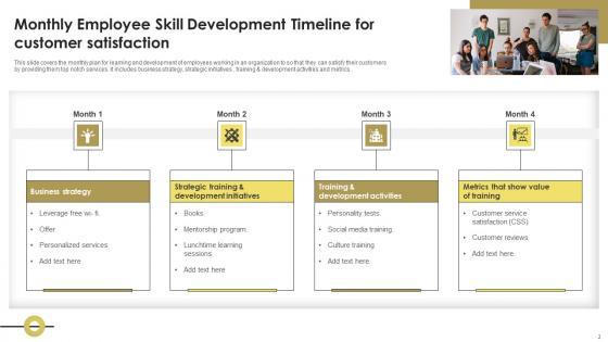 This slide covers the monthly plan for learning and development of employees working in an organization to so that they can satisfy their customers by providing them top notch services. It includes business strategy, strategic initiatives, training and development activities and metrics. Showcasing this set of slides titled Monthly Employee Skill Development Timeline For Customer Satisfaction Icons Pdf. The topics addressed in these templates are Business Strategy, Development Activities, Show Value Of Training. All the content presented in this PPT design is completely editable. Download it and make adjustments in color, background, font etc. as per your unique business setting. This slide covers the monthly plan for learning and development of employees working in an organization to so that they can satisfy their customers by providing them top notch services. It includes business strategy, strategic initiatives, training and development activities and metrics.