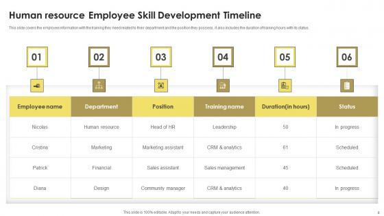 This slide covers the employee information with the training they need related to their department and the position they possess . it also includes the duration of training hours with its status. Pitch your topic with ease and precision using this Human Resource Employee Skill Development Timeline Diagrams Pdf. This layout presents information on Human Resource Employee, Skill Development Timeline. It is also available for immediate download and adjustment. So, changes can be made in the color, design, graphics or any other component to create a unique layout. This slide covers the employee information with the training they need related to their department and the position they possess . it also includes the duration of training hours with its status.