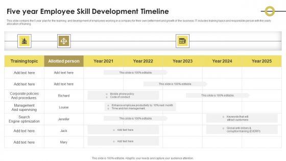 This slide contains the 5 year plan for the learning and development of employees working in a company for their own betterment and growth of the business. IT includes training topics and responsible person with the yearly allocation of training. Showcasing this set of slides titled Five Year Employee Skill Development Timeline Download Pdf. The topics addressed in these templates are Five Year Employee, Skill Development Timeline. All the content presented in this PPT design is completely editable. Download it and make adjustments in color, background, font etc. as per your unique business setting. This slide contains the 5 year plan for the learning and development of employees working in a company for their own betterment and growth of the business. IT includes training topics and responsible person with the yearly allocation of training.