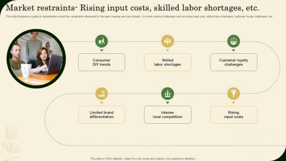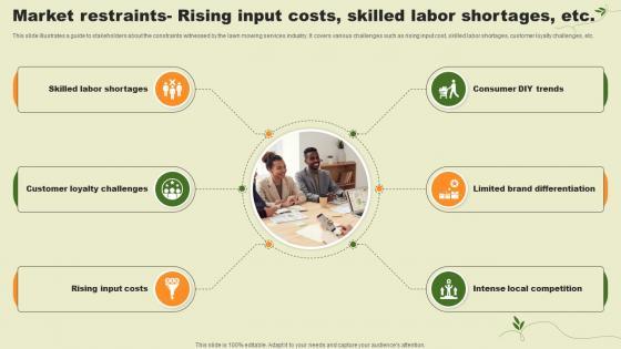 This slide illustrates a guide to stakeholders about the constraints witnessed by the lawn mowing services industry. It covers various challenges such as rising input cost, skilled labor shortages, customer loyalty challenges, etc. This Lawn Care Services Business Plan Market Restraints Rising Input Costs Skilled Labor Shortages BP SS V is perfect for any presentation, be it in front of clients or colleagues. It is a versatile and stylish solution for organizing your meetings. The Lawn Care Services Business Plan Market Restraints Rising Input Costs Skilled Labor Shortages BP SS V features a modern design for your presentation meetings. The adjustable and customizable slides provide unlimited possibilities for acing up your presentation. Slidegeeks has done all the homework before launching the product for you. So, do not wait, grab the presentation templates today This slide illustrates a guide to stakeholders about the constraints witnessed by the lawn mowing services industry. It covers various challenges such as rising input cost, skilled labor shortages, customer loyalty challenges, etc.