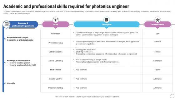 This slide represents the skills required for photonic engineers, such as innovation, problem-solving while doing experiments, communication skills for writing grant applications and studying summaries, mathematics, active listening, quality control, and decision-making.Create an editable Academic And Professional Skills Silicon Photonics SiPh It Ppt Example that communicates your idea and engages your audience. Whether you are presenting a business or an educational presentation, pre-designed presentation templates help save time. Academic And Professional Skills Silicon Photonics SiPh It Ppt Example is highly customizable and very easy to edit, covering many different styles from creative to business presentations. Slidegeeks has creative team members who have crafted amazing templates. So, go and get them without any delay. This slide represents the skills required for photonic engineers, such as innovation, problem-solving while doing experiments, communication skills for writing grant applications and studying summaries, mathematics, active listening, quality control, and decision-making.