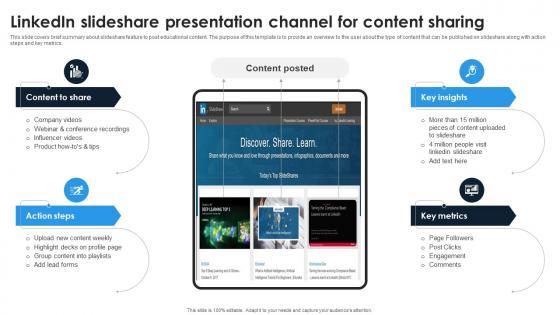 This slide covers brief summary about slideshare feature to post educational content. The purpose of this template is to provide an overview to the user about the type of content that can be published on slideshare along with action steps and key metrics. Present like a pro with Linkedin Slideshare Presentation Channel For Content Sharing Template PDF Create beautiful presentations together with your team, using our easy to use presentation slides. Share your ideas in real time and make changes on the fly by downloading our templates. So whether you are in the office, on the go, or in a remote location, you can stay in sync with your team and present your ideas with confidence. With Slidegeeks presentation got a whole lot easier. Grab these presentations today.