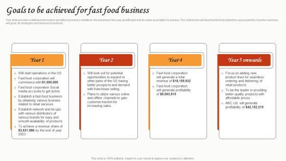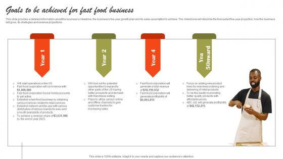 This slide provides a detailed information about the businesss milestone, the businesss five year growth plan and its sales assumption to achieve. The milestones will describe the forecasted five year projection, how the business will grow, its strategies and revenue projections.Crafting an eye-catching presentation has never been more straightforward. Let your presentation shine with this tasteful yet straightforward Goals To Be Achieved For Fast Food Business Small Fast Food Business Plan Rules Pdf template. It offers a minimalistic and classy look that is great for making a statement. The colors have been employed intelligently to add a bit of playfulness while still remaining professional. Construct the ideal Goals To Be Achieved For Fast Food Business Small Fast Food Business Plan Rules Pdf that effortlessly grabs the attention of your audience. Begin now and be certain to wow your customers. This slide provides a detailed information about the businesss milestone, the businesss five year growth plan and its sales assumption to achieve. The milestones will describe the forecasted five year projection, how the business will grow, its strategies and revenue projections.